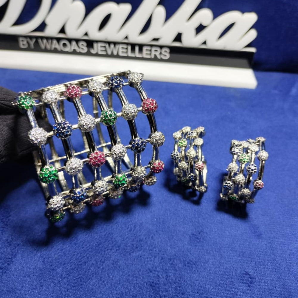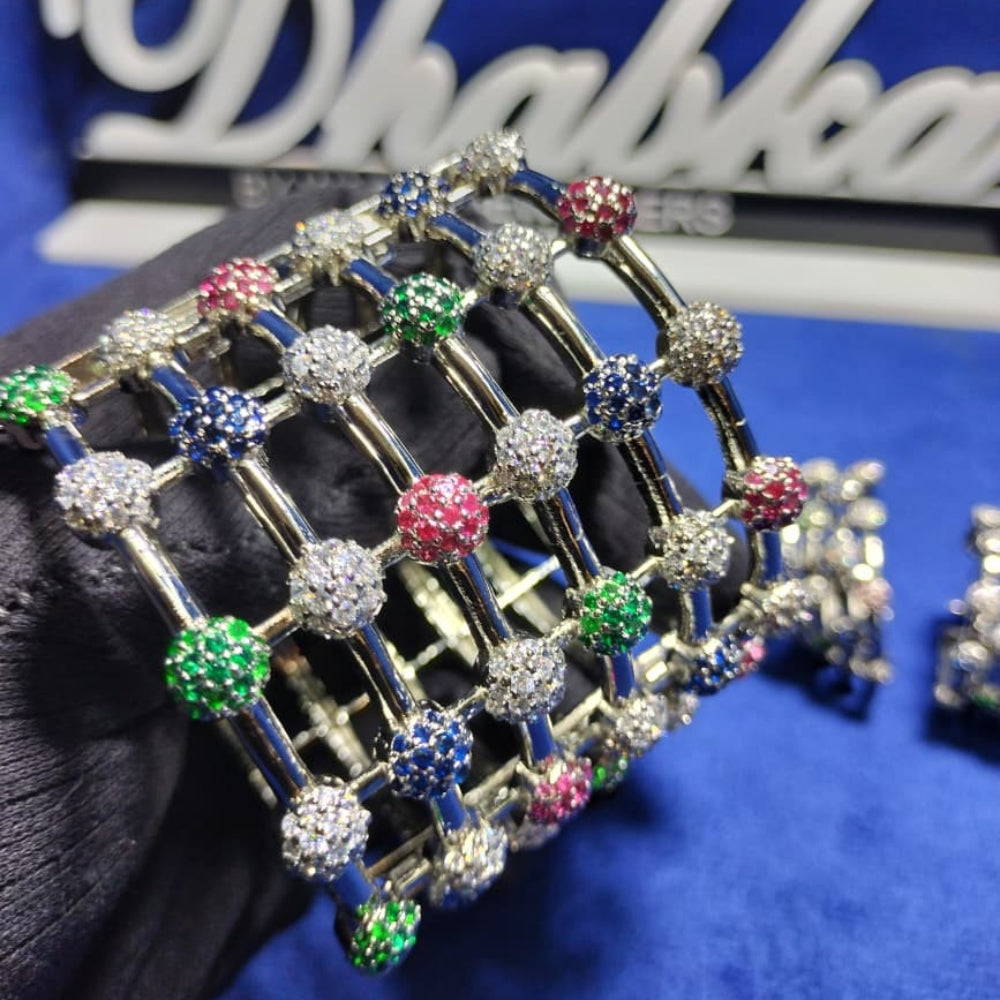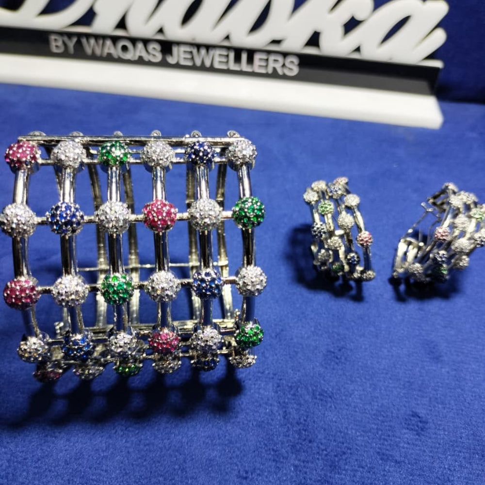 Description: 925 Sterling Silver Set including Earrings and Bangle with multi colors stones setting